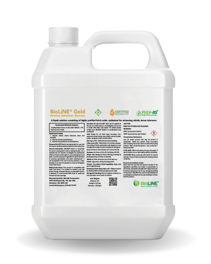 Un acide fulvique liquide, purifié et concentré, dont l'utilisation est recommandée dans le cadre de tous les programmes de fertilisation afin d'augmenter le rendement et la vigueur des cultures. BioLiNE® Gold peut être utilisé sur toutes les cultures, qu'elles soient en terre ou hydroponiques. Il peut également être utilisé comme ingrédient dans les traitements de semences pour améliorer la germination et le développement précoce des plantes. Pour les grandes cultures, il peut être appliqué au sol dans le sillon, en bandes ou en bandes latérales ; il peut également être appliqué par fertigation ou en pulvérisation foliaire.